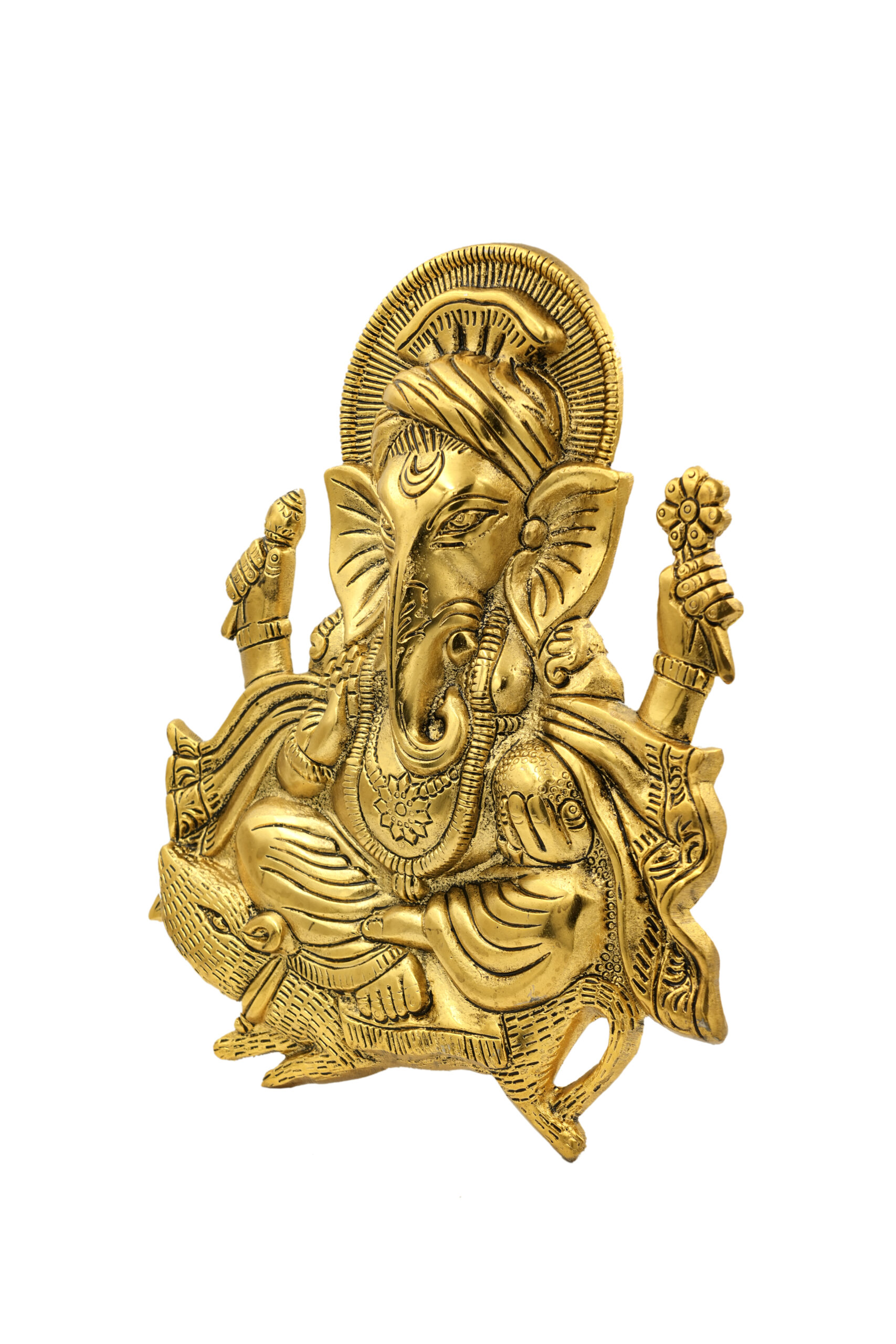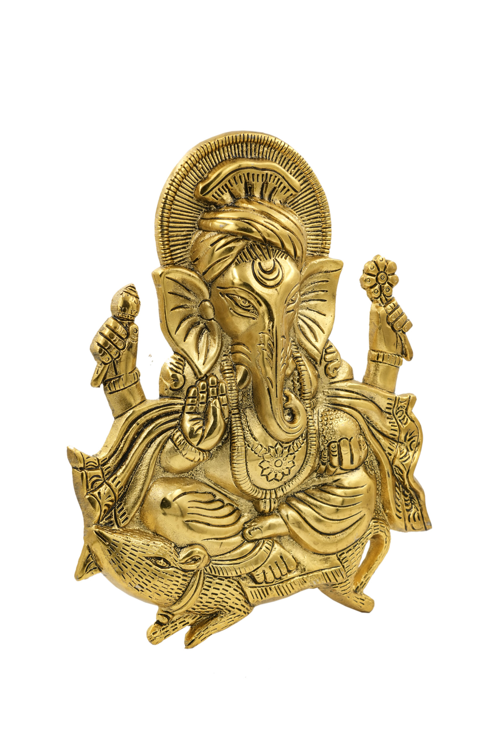 Bring divine blessings and artistic elegance to your space with this exquisite Hastam Metal Ganesha Wall Hanging Art. Standing 10 inch (26 cm) in height, this meticulously crafted golden Lord Ganesh sculpture depicts the beloved deity in traditional seated pose atop his mount. The detailed metalwork showcases intricate designs, from the ornate crown and flowing robes to the symbolic elements like the modak in hand. The radiant golden finish adds a touch of luxury while highlighting the fine craftsmanship of every curve and pattern. Perfect for your entrance way, prayer room, living area, or any space needing a touch of spiritual aesthetics. This wall hanging serves as both a stunning piece of décor and a symbol of wisdom, prosperity and good fortune. The durable metal construction ensures long-lasting beauty while making it easy to mount on any wall. Transform your home with this magnificent representation of Lord Ganesha that combines devotional significance with artistic excellence.